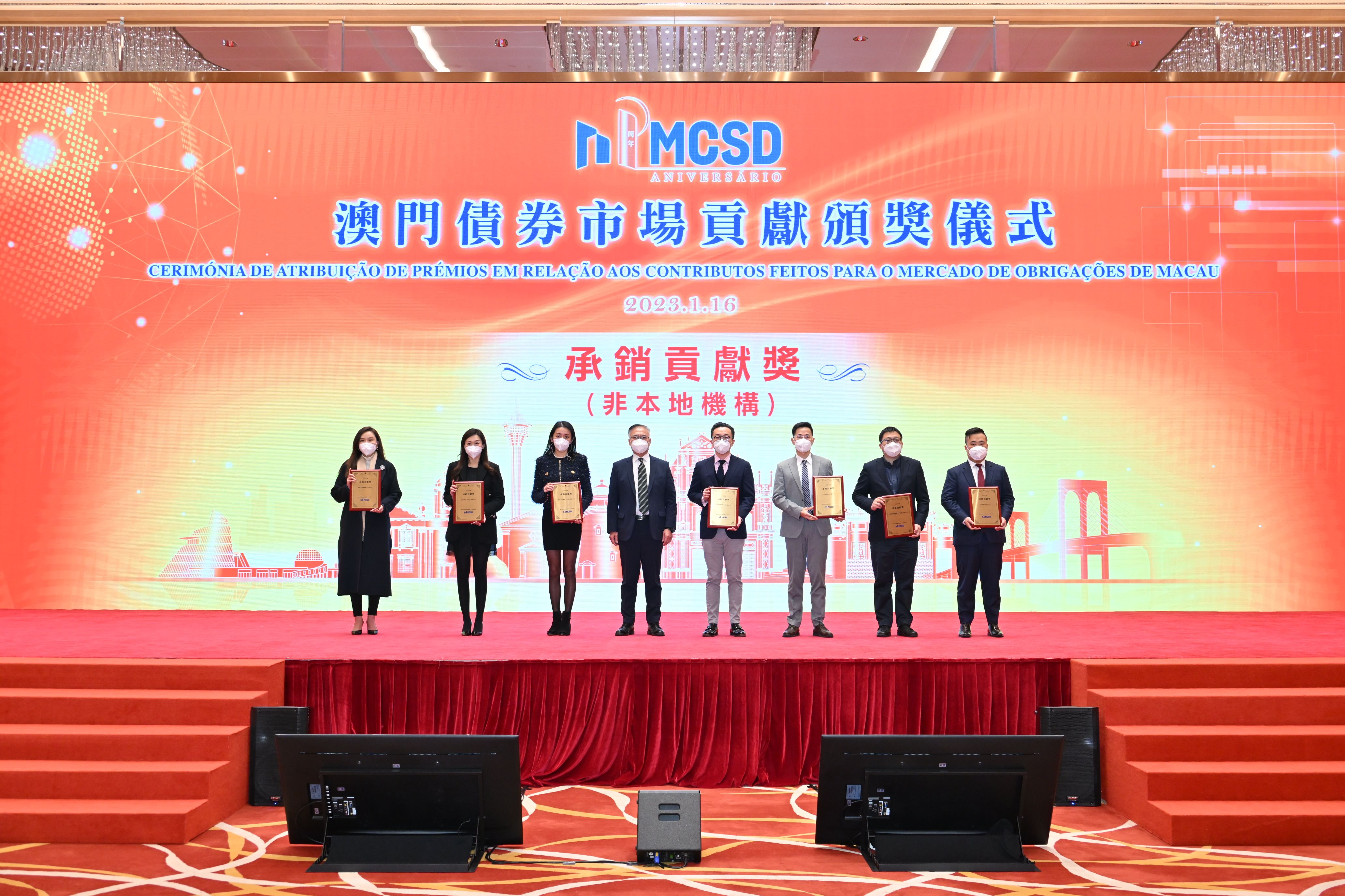 2023年1月16日,澳门金融管理局与澳门中央证券托管结算一人有限公司(MCSD)合办活动庆祝MCSD成立一周年,在活动仪式上,中金公司被授予2022年度承销贡献奖。该奖项旨在嘉许过去一年为澳门债券市场发展助力的承销机构,肯定其在澳门债券市场做出的贡献。