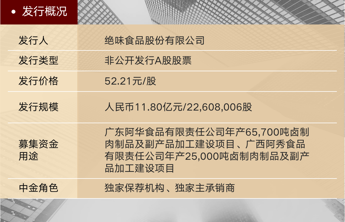 1月9日,绝味食品股份有限公司(“绝味食品”或“公司”,代码:603517.SH)非公开发行A股股票项目正式完成,本次发行规模为11.80亿元人民币,中金公司担任本次项目的独家保荐机构、独家主承销商。借助本次发行,绝味食品将进一步有效扩充产能,加快泛卤味赛道的布局,为主业扩张及业务外延打好坚实的基础,进一步增强龙头企业的市场竞争力。