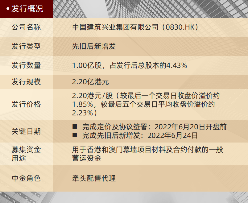 中国建筑兴业集团有限公司(0830.HK,以下简称“中国建筑兴业”或“公司”) 港股先旧后新增发项目已于2022年6月24日完成,发行规模为2.20亿港元,中金公司担任本次交易的牵头配售代理。