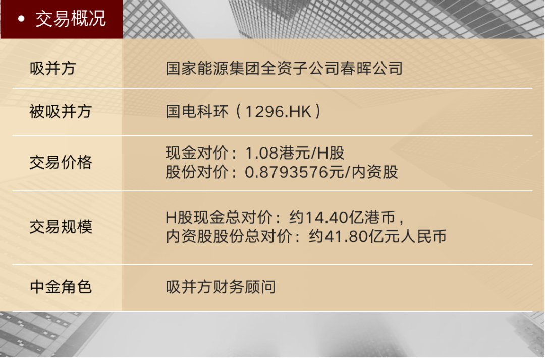 5月30日,国家能源投资集团有限责任公司(“国家能源集团”)全资子公司北京春晖青云科技环保有限公司(“春晖公司”)完成以吸收合并方式将国电科技环保集团股份有限公司(“国电科环”,1296.HK)私有化。中金公司担任本次项目吸并方财务顾问。
