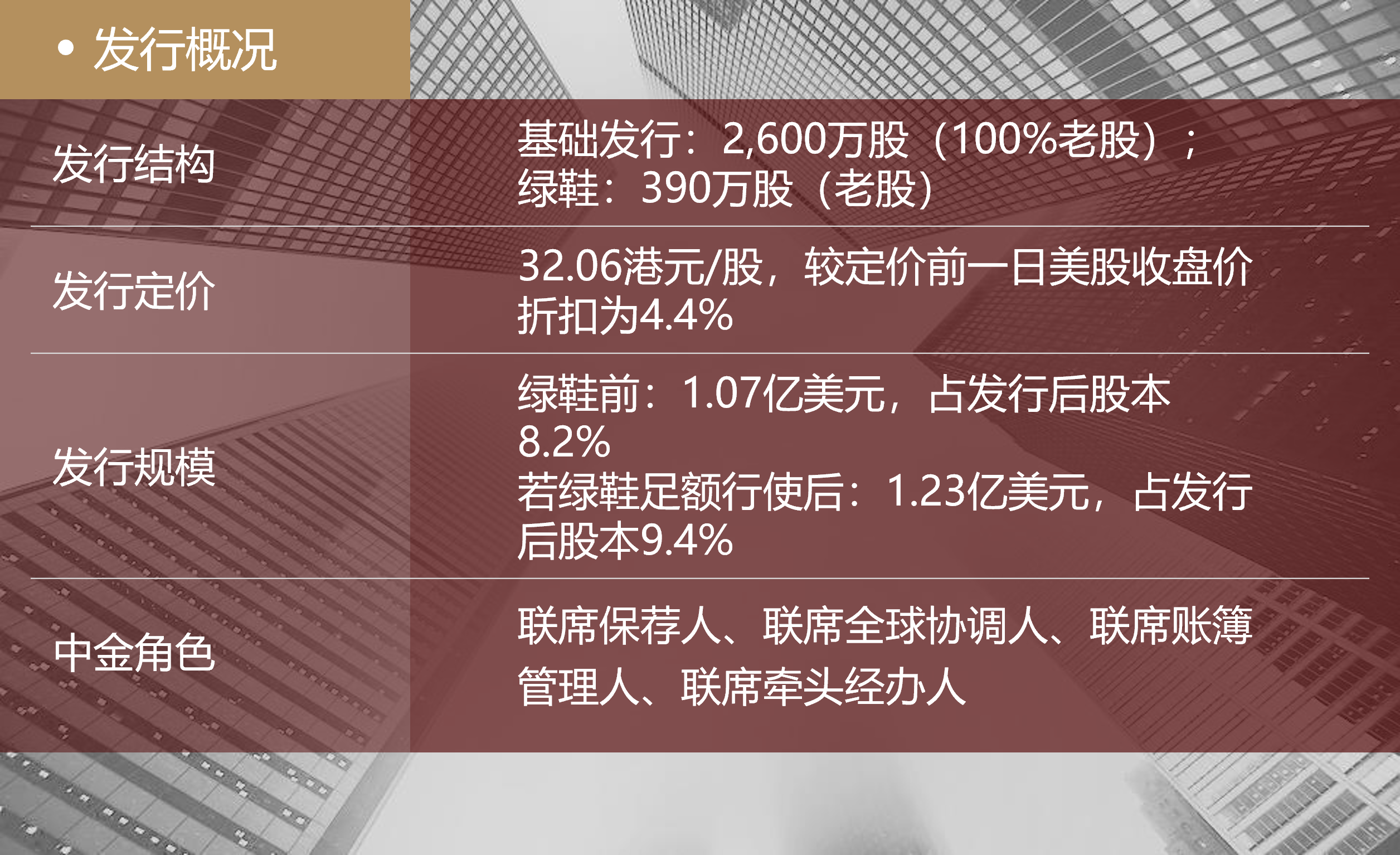 作为以“植根中国,融通世界”为目标,并坚持“以人为本,以国为怀”理念的中国领先投资银行,中金公司一直致力于为客户提供高质量金融增值服务。凭借丰富的资本市场经验、境内外业务平台的无缝对接,中金公司将持续为客户提供一流的金融服务,为企业在不同发展阶段的全球化资本运作战略做出贡献。
