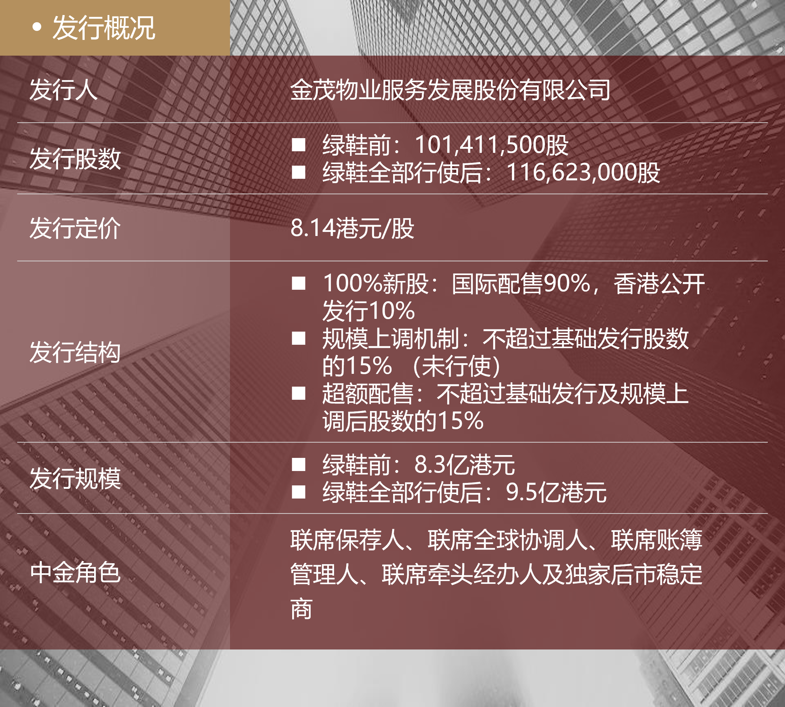 金茂服务是中国中化及中国金茂旗下高端物业管理和城市运营服务平台,中金公司与中国中化拥有逾十年的长期战略合作。本项目是两化合并以来,中金公司服务新中化体系的首单IPO项目,具有里程碑意义。未来,中金公司将继续秉承“植根中国,融通世界”的服务理念,为中国中化、中国金茂和金茂服务提供全方位、高质量的资本市场服务。