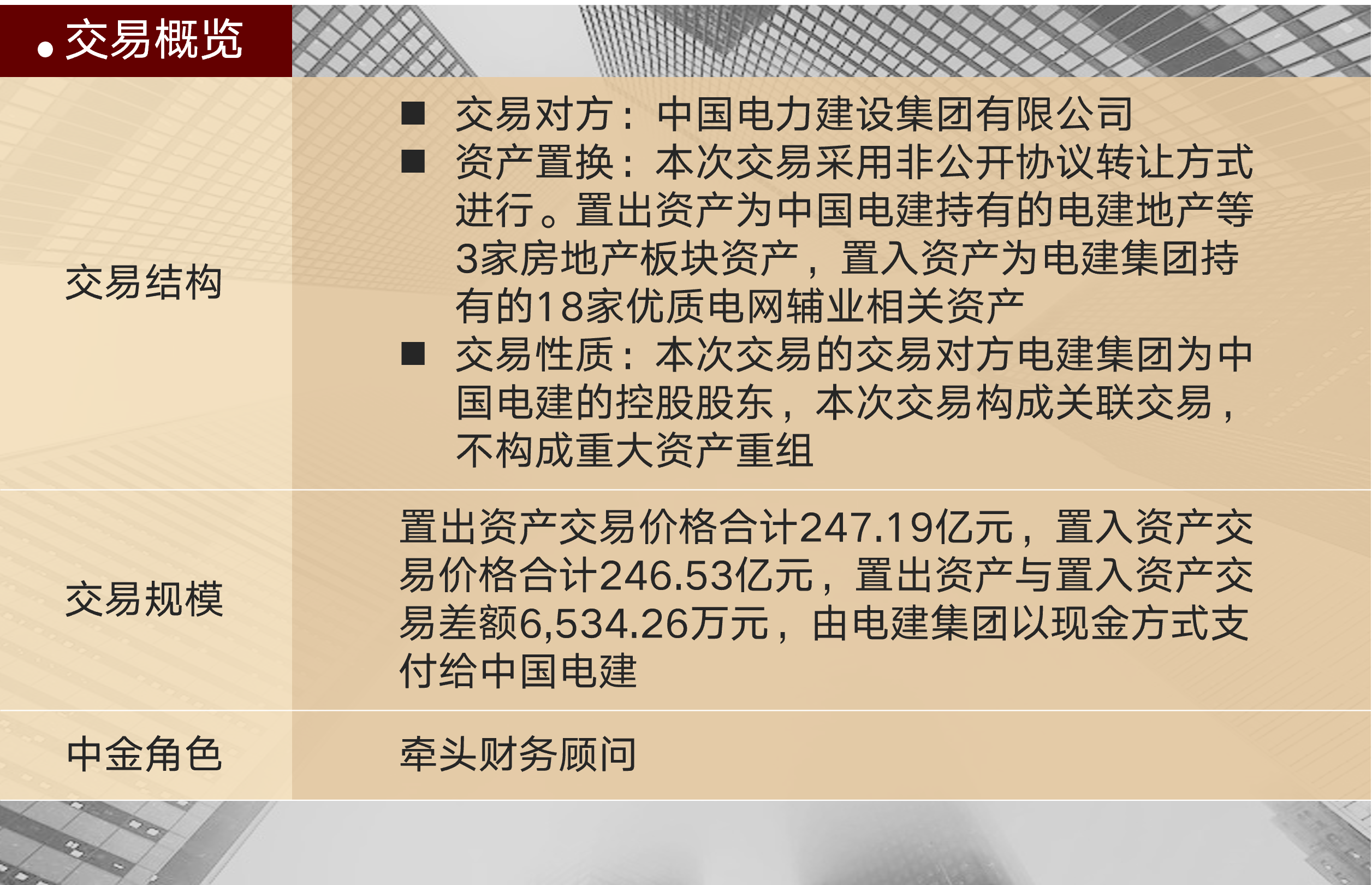 中金公司凭借市场领先的大型央企服务能力、建筑行业优异业绩和重组交易丰富执行经验,全面统筹本次交易各条线工作,并协助公司确保交易方案获得各方一致认可,最终相关议案获得股东大会98.48%赞成率高票通过。