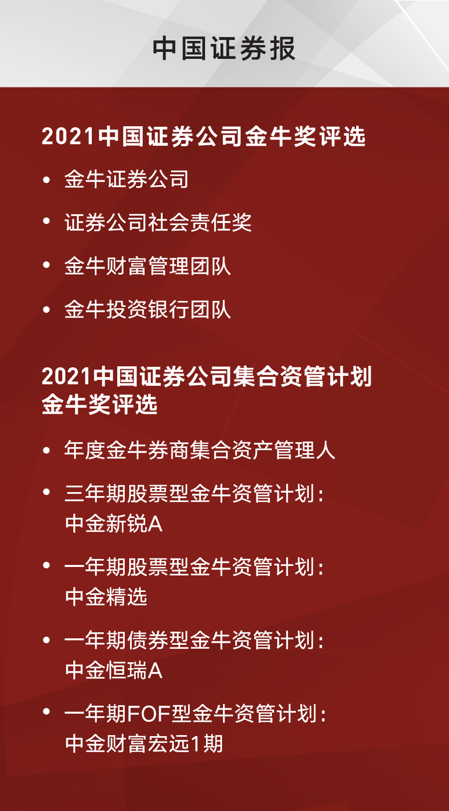 中金在《中国证券报》2021金牛奖评选中再次斩获多项殊荣