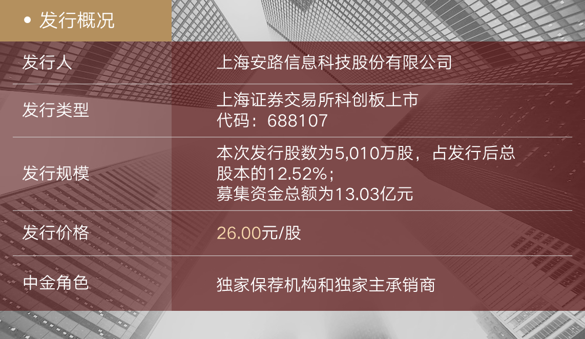 11月12日,上海安路信息科技股份有限公司(简称“安路科技”或“公司”,股票代码688107.SH)正式在上海证券交易所科创板上市,发行规模约13亿人民币(“本次发行”)。中金公司担任本项目的独家保荐机构和独家主承销商。