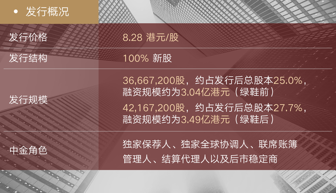中金公司作为独家保荐人,凭借丰富的项目经验和对房地产行业的深入理解,协助公司顺利通过聆讯;作为独家全球协调人,在物管行业港股上市公司近期股价出现回调的情况下,积极推进销售工作,成功协助公司引入两家重要基石投资者,并吸引了国际著名对冲基金参与投资,香港公开发售也取得了超额认购,助力公司成功完成发行。