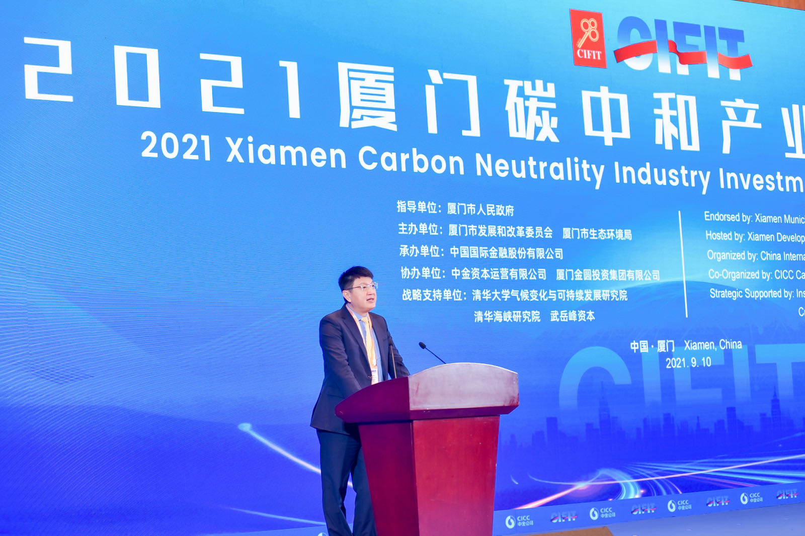 2021厦门碳中和产业投融资峰会由厦门市人民政府指导,厦门市发展和改革委员会、厦门市生态环境局主办,中国国际金融股份有限公司(简称“中金公司”)承办,中金资本运营有限公司(简称“中金资本”)、厦门金圆投资集团有限公司(简称“金圆集团”)协办,并得到清华大学气候变化与可持续发展研究院、清华海峡研究院、武岳峰资本的战略支持。