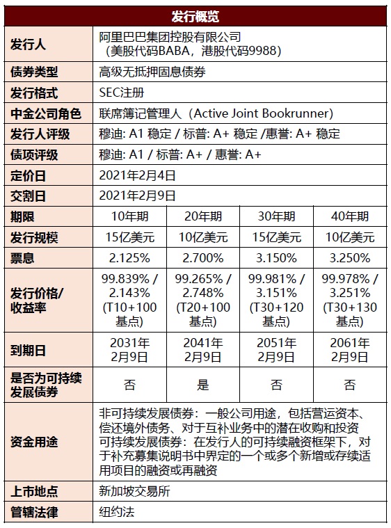2021年2月4日,阿里巴巴集团控股有限公司(简称“阿里巴巴集团”或“公司”,美股代码BABA,港股代码9988)成功完成50亿美元SEC注册、多品种高级无抵押固息债券发行。中金公司担任本次发行的联席簿记管理人。