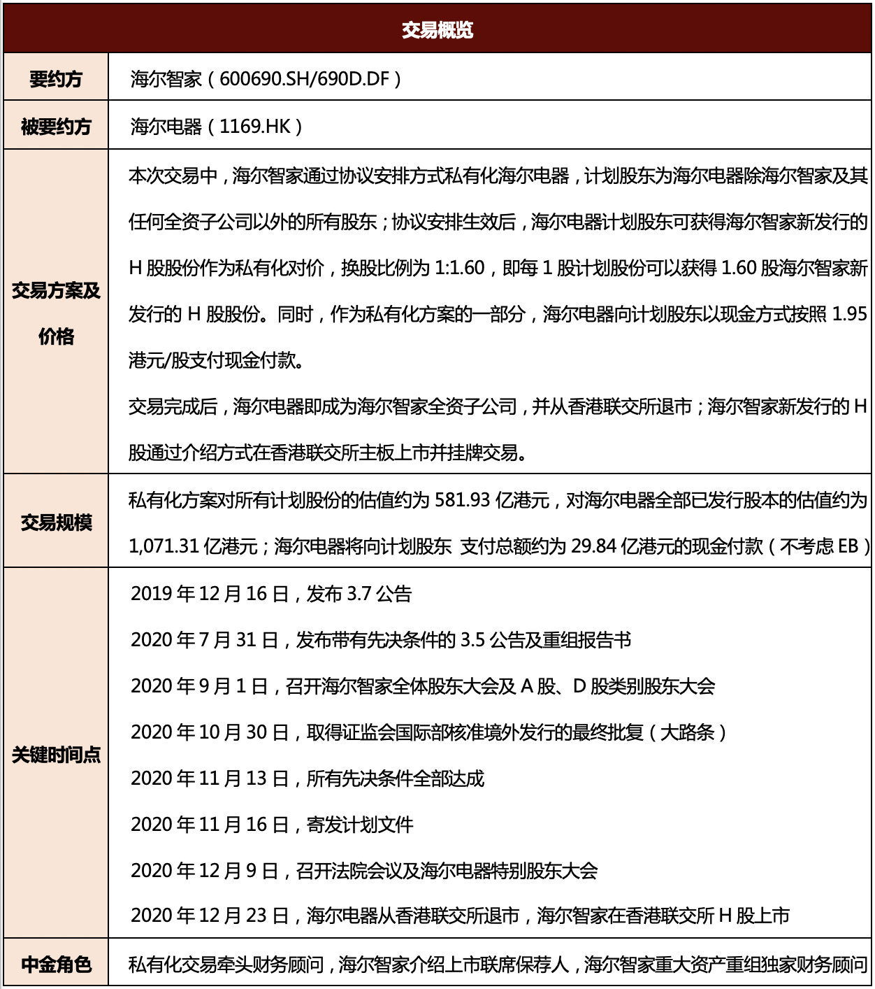 中金公司助力海尔智家开创私有化新模式