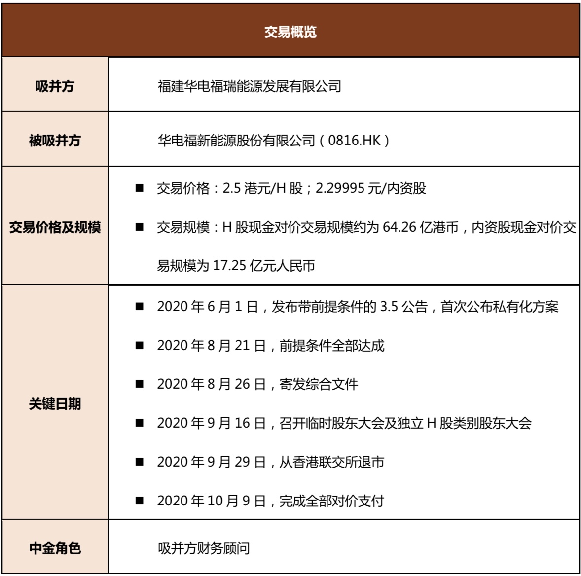 2020年10月9日,福建华电福瑞能源发展有限公司(“华电福瑞”或“吸并方”)完成通过吸收合并的方式私有化华电福新能源股份有限公司(“华电福新”或“被吸并方”)的对价支付。本次交易中,中金担任吸并方华电福瑞财务顾问。