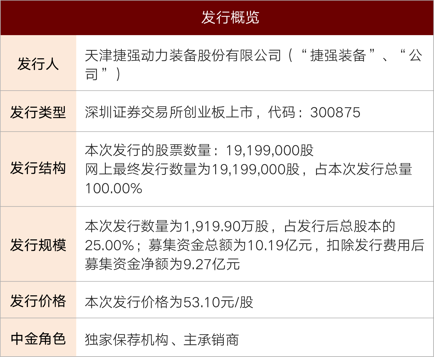 2020年8月24日,天津捷强动力装备股份有限公司(以下简称“捷强装备”或“公司”,股票代码:300875.SZ)正式在深圳证券交易所创业板挂牌上市。捷强装备本次公开发行总股数1,919.90万股,占发行后总股本的25.00%;发行价格53.10元/股;募集资金总额为10.19亿元。中金公司在本项目中担任独家保荐机构和主承销商。