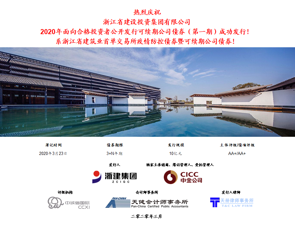 2020年3月23日,中金公司作为独家主承销商完成了浙江省建设投资集团有限公司2020年面向合格投资者公开发行可续期公司债券(第一期)(疫情防控债)的簿记建档工作。本期债券实际发行规模10亿元,期限为3+N年期,系浙江省建筑业首单交易所疫情防控债券暨可续期公司债券。