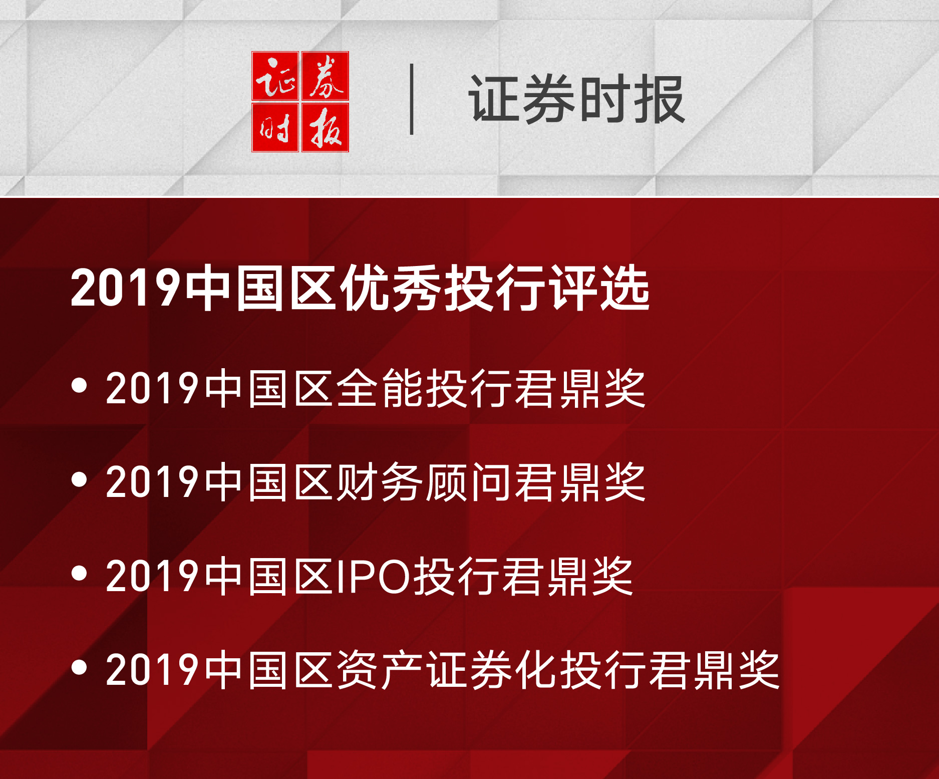 中金公司荣获《证券时报》2019中国区投资银行评选“全能投行君鼎奖”等多项荣誉